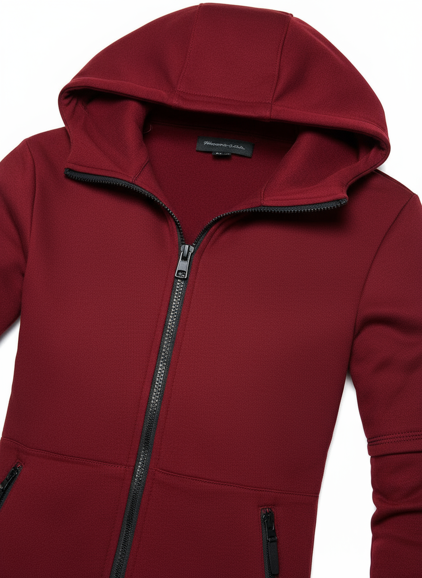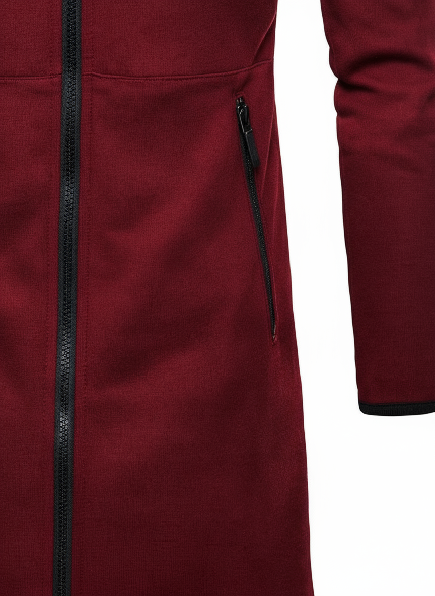The deep maroon color gives it a bold, sophisticated look, while the streamlined silhouette enhances its contemporary appeal. A full-length zipper provides ease of wear, and the attached hood adds an extra layer of protection against the elements. Two slanted zippered side pockets ensure both practicality and secure storage for your essentials.